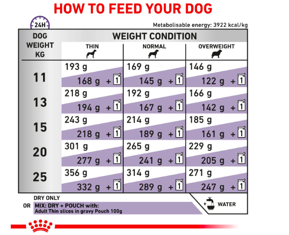 A complete feed for adult medium breed dogs over 12 months old with weights 11 to 25 kg.