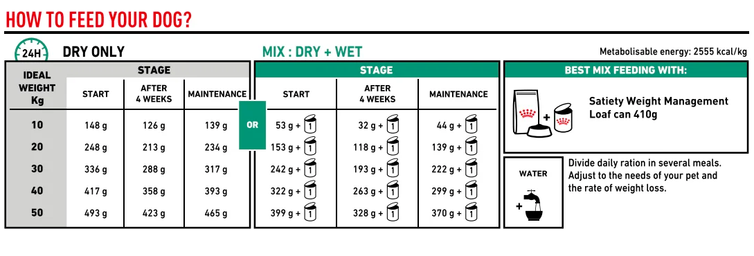 The Satiety Support Canine formula with high mineral and vitamin concentration compensates for the effect of energy restriction ensuring an appropriate nutritional supply.