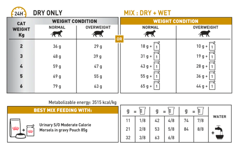 A complete dietetic feed for overweight adult cats to dissolve and prevent the recurrence of struvite urinary stones.