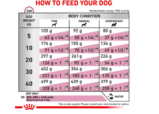 ROYAL CANIN® Renal is scientifically formulated to support renal function in cases of chronic kidney disease. Recommendations: It is recommended that a veterinarian’s opinion be sought before use or before extending the period of use. Initially feed Renal dry for up to 6 months in cases of chronic renal insufficiency. Recommended in cases of: Azotemic Chronic Kidney Disease (IRIS stage 2 to stage 4), Chronic Kidney Disease with proteinuria (IRIS stage 1 to 4). Not recommended in case of: growth, gestation and lactation. This diet is complete and balanced and can be fed long-term. A full health check should be performed by a veterinarian every 6 months.