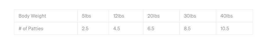 Serve as is or rehydrate by adding warm water. If your dog does not drink plenty of water at mealtime, we recommend rehydrating. To rehydrate, crumble and add 1/4 cup of water for every two patties. When feeding dry, always make sure your dog drinks ample fresh water at mealtime.