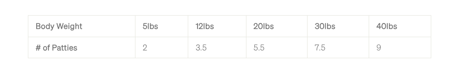Serve as is or rehydrate by adding warm water. If your dog does not drink plenty of water at mealtime, we recommend rehydrating. To rehydrate, crumble and add 1/4 cup of water for every two patties. When feeding dry, always make sure your dog drinks ample fresh water at mealtime.