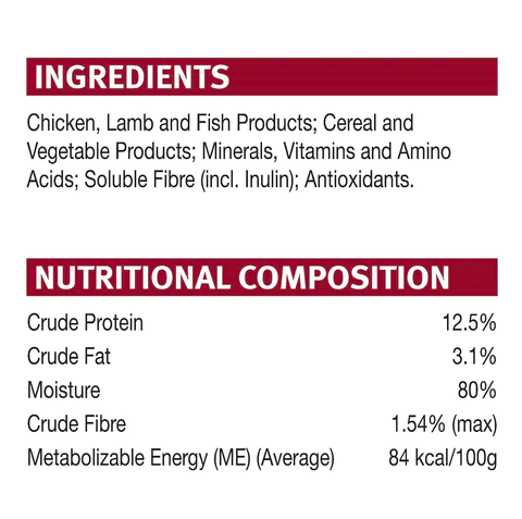 粗蛋白12.5%,粗脂肪3.1%,水分最大80%,粗纖維1.4%(典型值),可代謝能量(ME)84 kcal / 100g(平均)