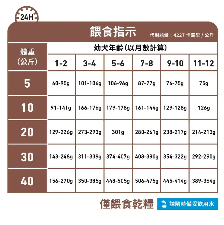 餵食指引:請參考表格。應預備足夠水份供飲用。
