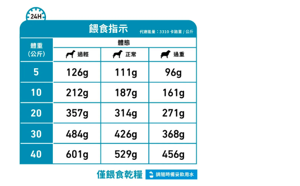 餵食指引:請參考表格。