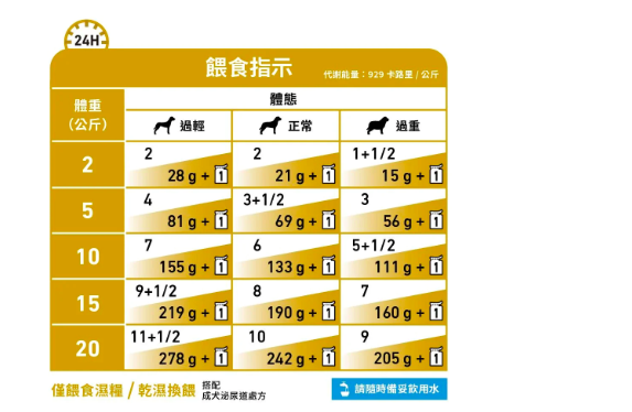餵食指引:請參考表格。