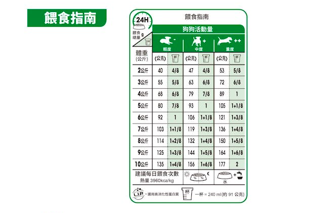 脫水禽肉蛋白、玉米、玉米粉、動物脂肪、玉米麩質植物分離蛋白*、小麥、水解動物蛋白、米、甜菜漿、礦物質、魚油、大豆油、酵母、果寡糖 *LIP:(植物分離蛋白)精選高消化性蛋白質具有極易吸收的特性
