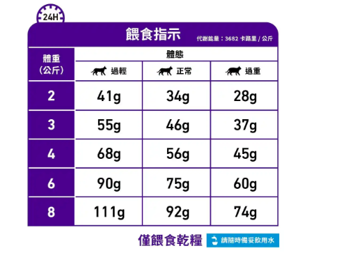 餵食指引:請參考表格。