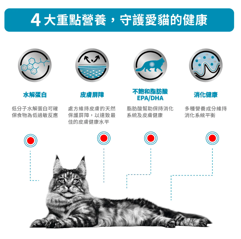 ROYAL CANIN 處方貓糧為貓貓準備的完整膳食飼料,可減少成分和營養素的不耐受性。處方貓糧精選高度水解的蛋白質來源;以及選擇純化的碳水化合物來源,食得安心,不用怕貓貓皮膚敏感/貓貓食物敏感。