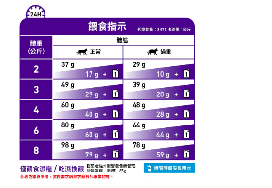 餵食指引:請參考表格。