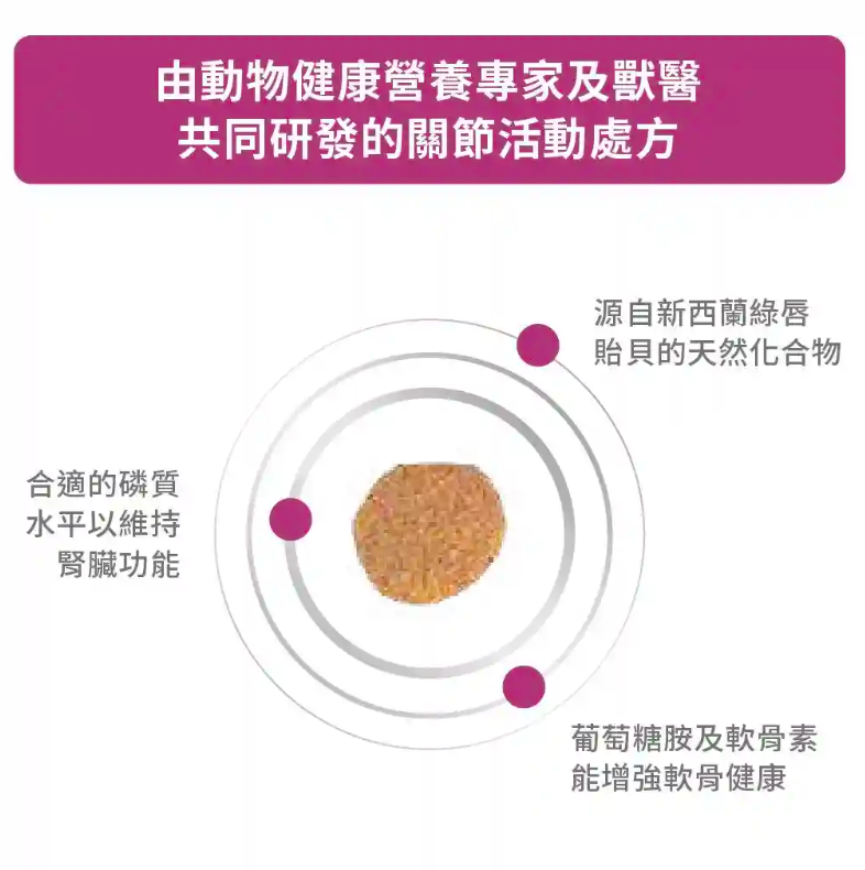 玉米粉、小麥麵筋*、玉米、大米、脫水禽肉、玉米麵筋、動物脂肪、植物纖維、水解動物蛋白、魚油、礦物質、大豆油、菊苣漿、低聚果糖、洋車前子殼和種子,新西蘭綠唇貽貝提取物(GLM 0.3%)、檸檬酸鉀、水解酵母(甘露寡糖來源)、水解甲殼類動物(葡萄糖胺來源)、水解軟骨(軟骨素來源)、萬壽菊提取物(葉黃素來源) )