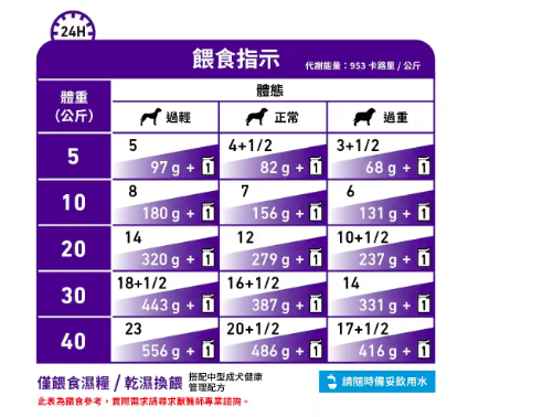 餵食指引:請參考包裝上表格。