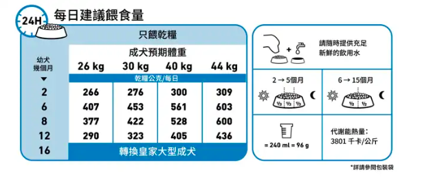適合生長期較長的大型犬幼犬在生長階段的適度能量需求。