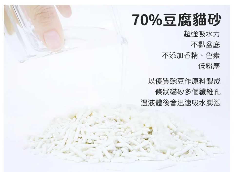 優質豌豆作原料製成,每條貓砂有多個纖維孔,遇液體後會迅速吸水膨漲。