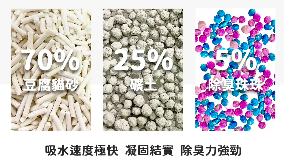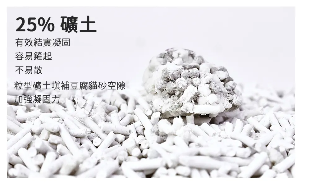 粒型礦土填補豆腐貓砂空隙,加強凝固力。