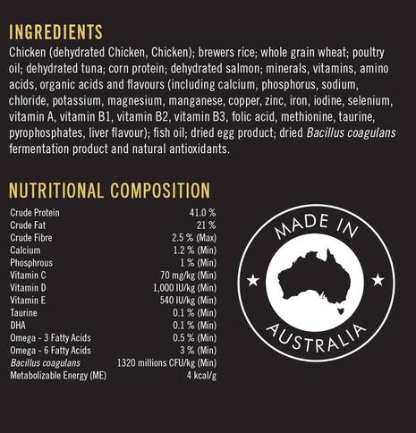雞肉(脫水雞肉、雞肉);啤酒大米;全麥小麥;家禽油;脫水金槍魚;玉米蛋白;脫水鮭魚;礦物質、維生素、氨基酸、有機酸和香料(包括鈣、磷、鈉、氯、鉀、鎂、錳、銅、鋅、鐵、碘、硒、維生素 A、維生素 B1、維生素 B2、維生素 B3、葉酸酸、維生素 B5、維生素 B6、維生素 B12、維生素 C、維生素 D、維生素 E、膽鹼、蛋氨酸、牛磺酸、焦磷酸鹽、肝味);魚油;幹蛋製品;乾燥的凝結芽孢桿菌發酵產物和天然抗氧化劑