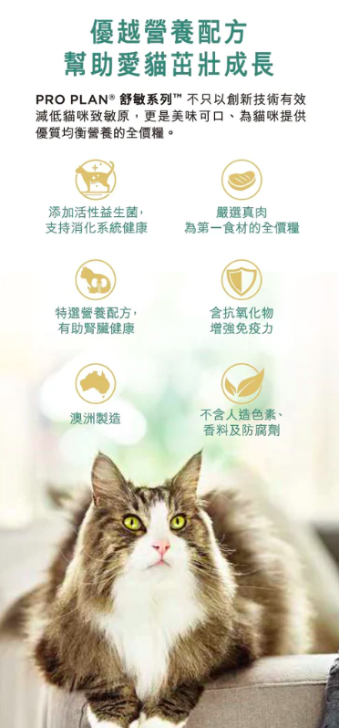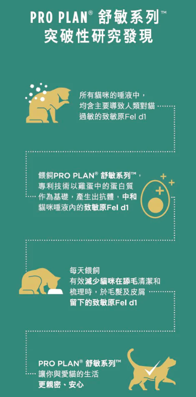 PRO PLAN®舒敏系列™更是全球首創,集合科研技術和營養的全價貓糧,持續餵食3星期,平均減少貓咪毛髮和皮屑中的致敏源達47%。是真正健康,是真正高質又有益的寵物食品。