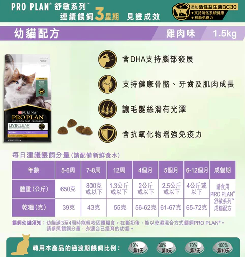 - 主人可放心為心愛的貓貓選擇餵養PURINA PRO PLAN 舒敏系列成貓7+配方,我們量身定制的營養對貓咪的長期健康和福祉產生積極性的影響。 雖然您很著急想看到 PRO PLAN® 在您的貓身上產生的影響,但請等待 7 到 10 天的時間從它們目前的食物逐步過渡到PRO PLAN®。 這使您的貓的消化酶能夠逐漸適應成分和營養成分的變化,幫助正確消化食物並幫助防止胃部不適。 每天,只需減少餵一點以前所吃的食物,多增加餵一點 PRO PLAN®,直到只完全餵食 PRO PLAN®
