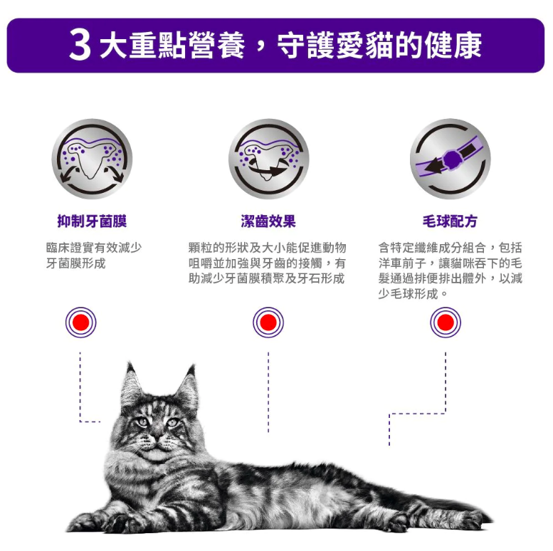 結合多種纖維,包括洋車前子,可將食入的毛髮從糞便中排除,進而控制毛球的形成