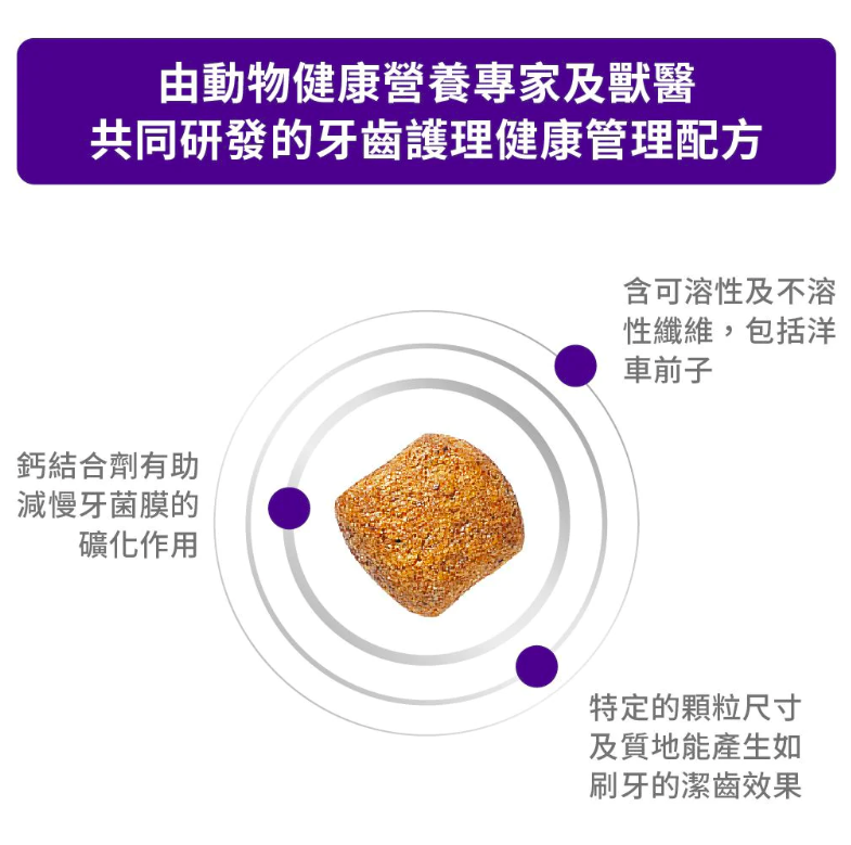 顆粒的形狀和大小讓動物容易咬食且和牙齒有適當接觸。這有助於減少牙菌斑堆積和牙結石形成